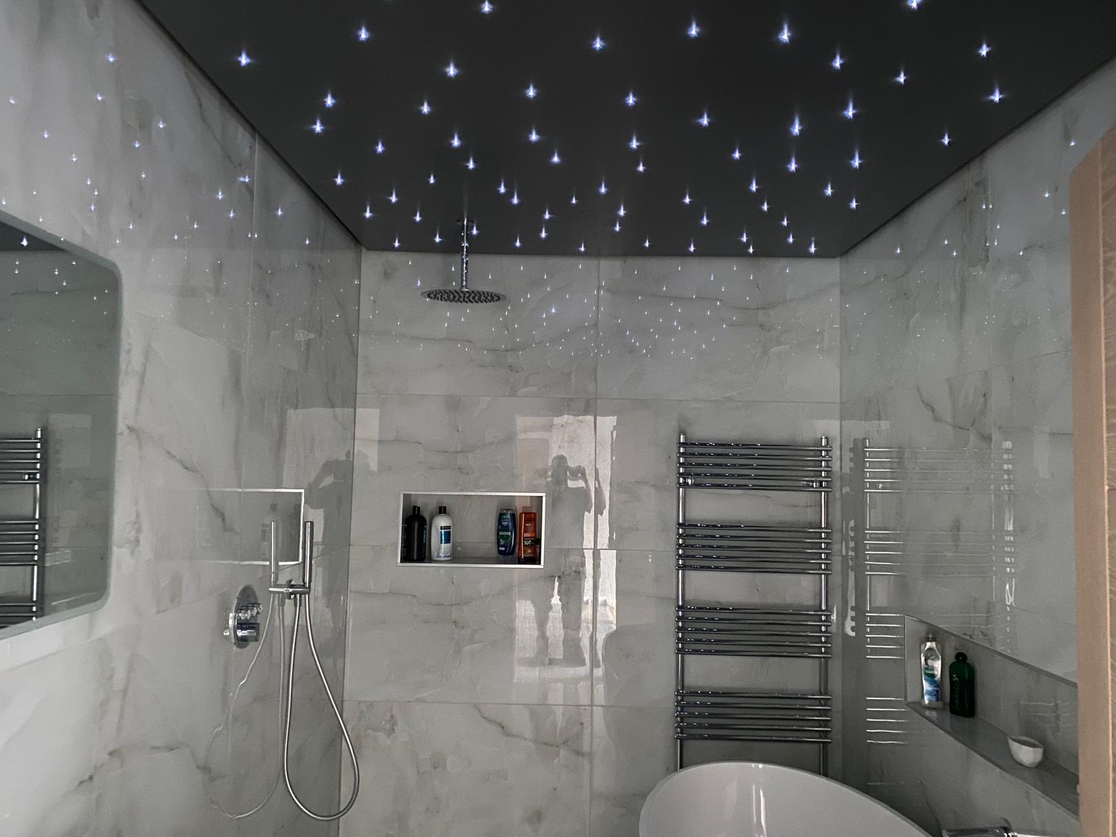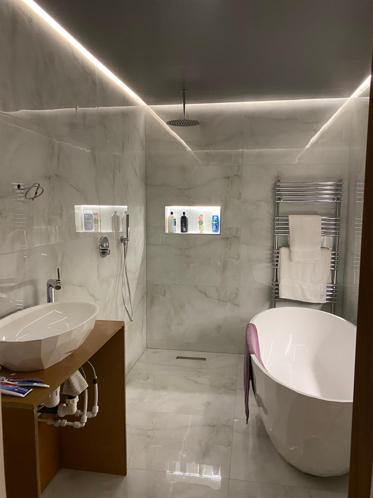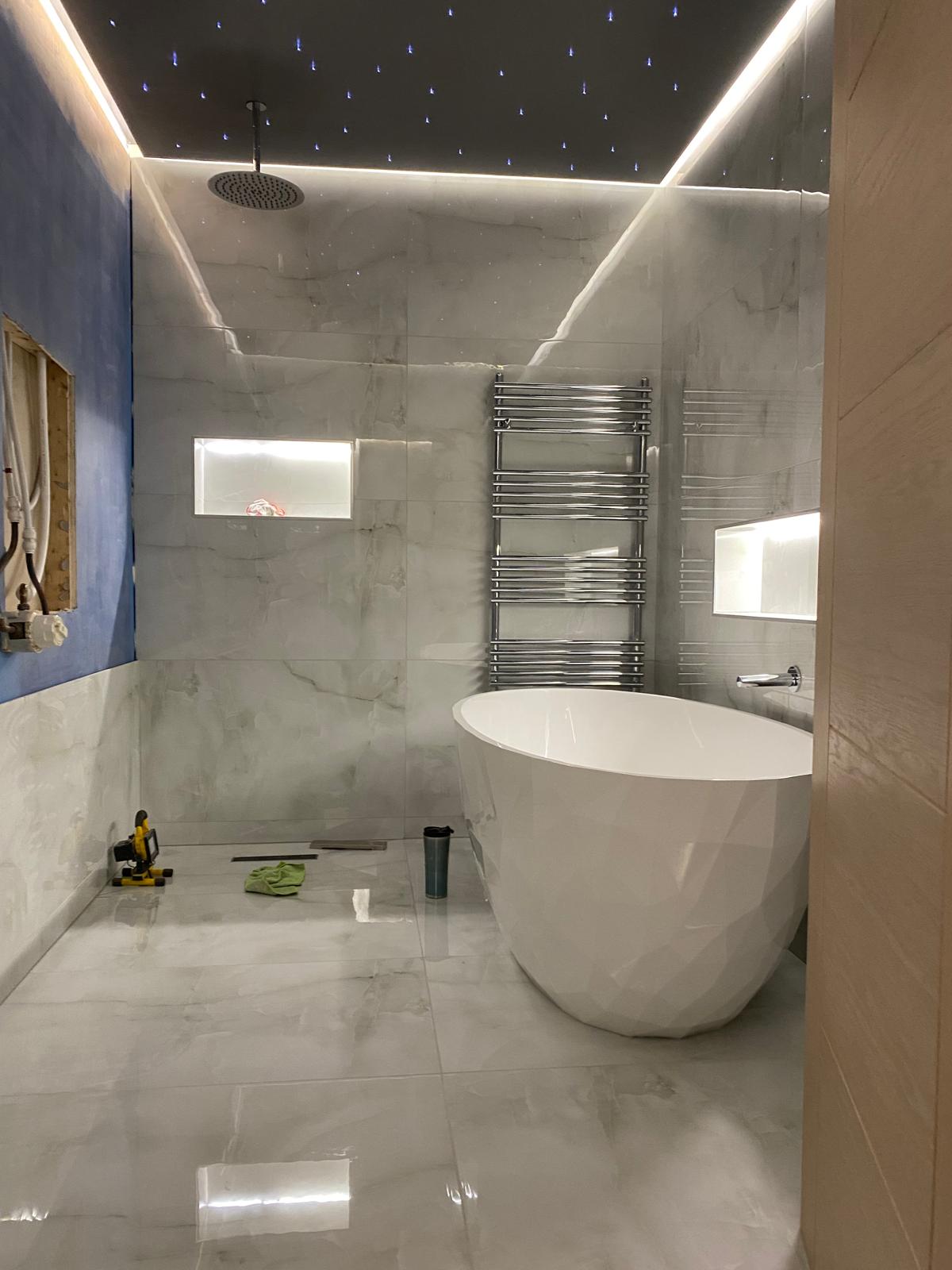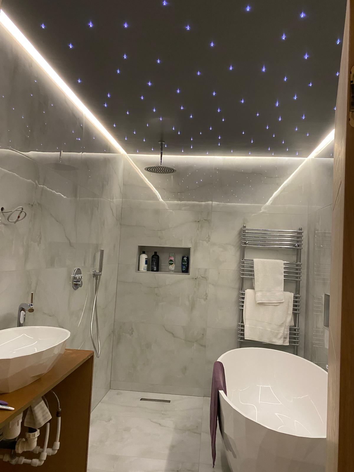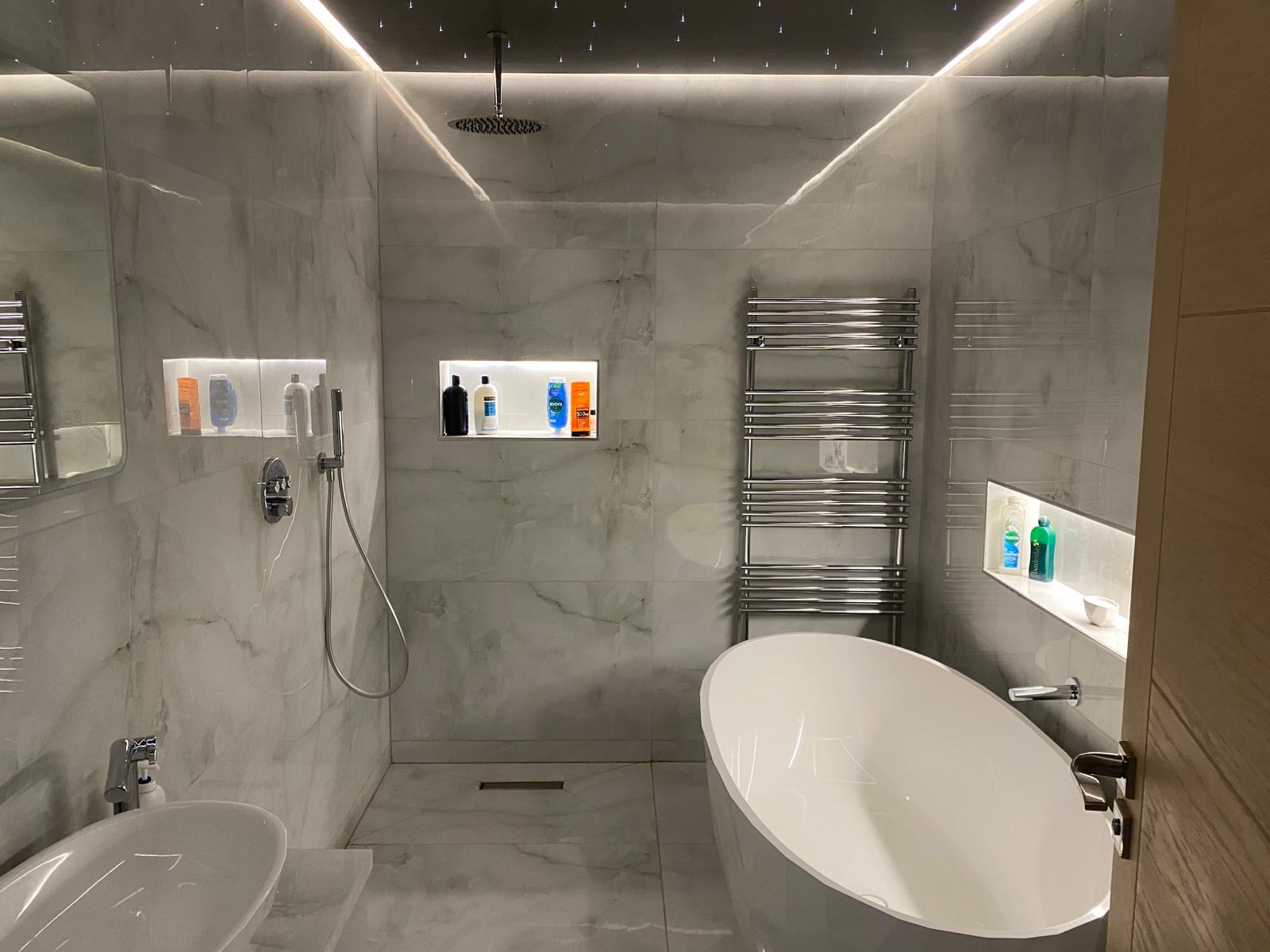 Our client wanted a luxurious and relaxing bathroom that felt like a place to unwind. We added a wet room area finished with large format tiles and included small built-in niches for storage. Fibre optic lights in the ceiling create a beautiful starlit effect at night. The finished space feels calm, elegant and a little bit special.