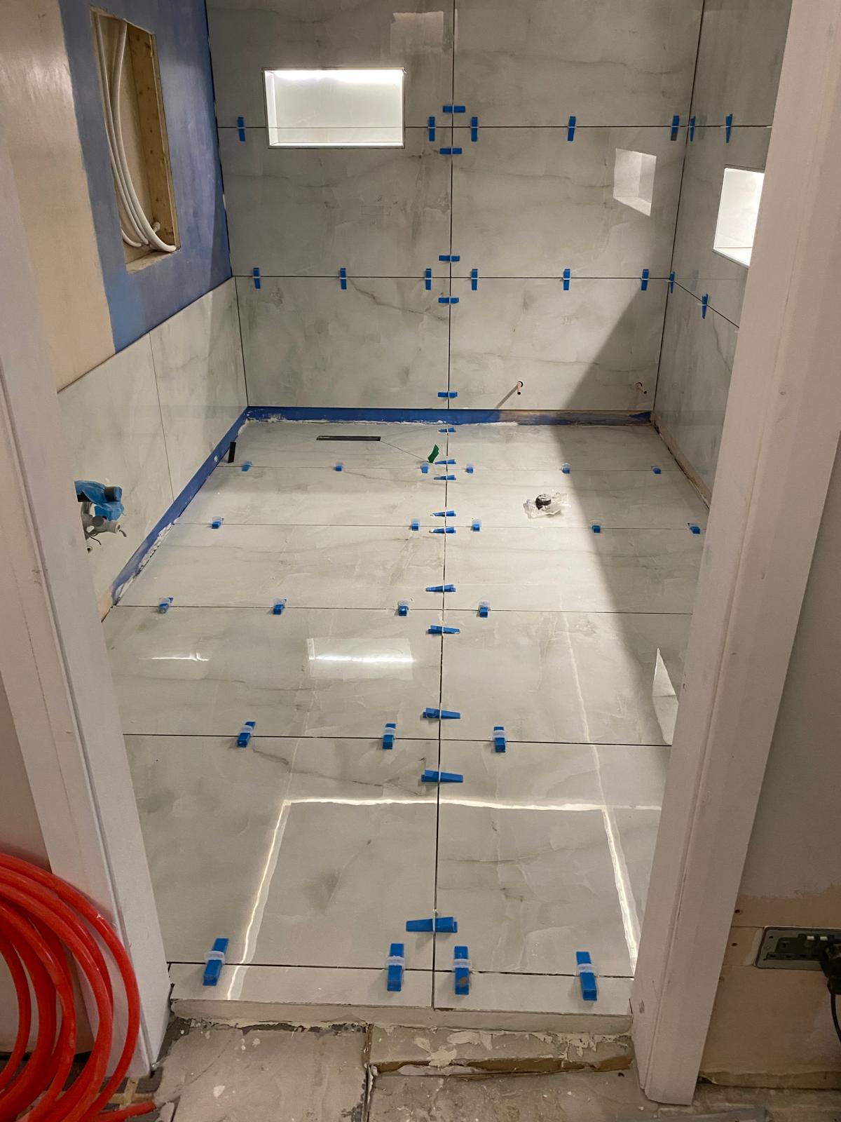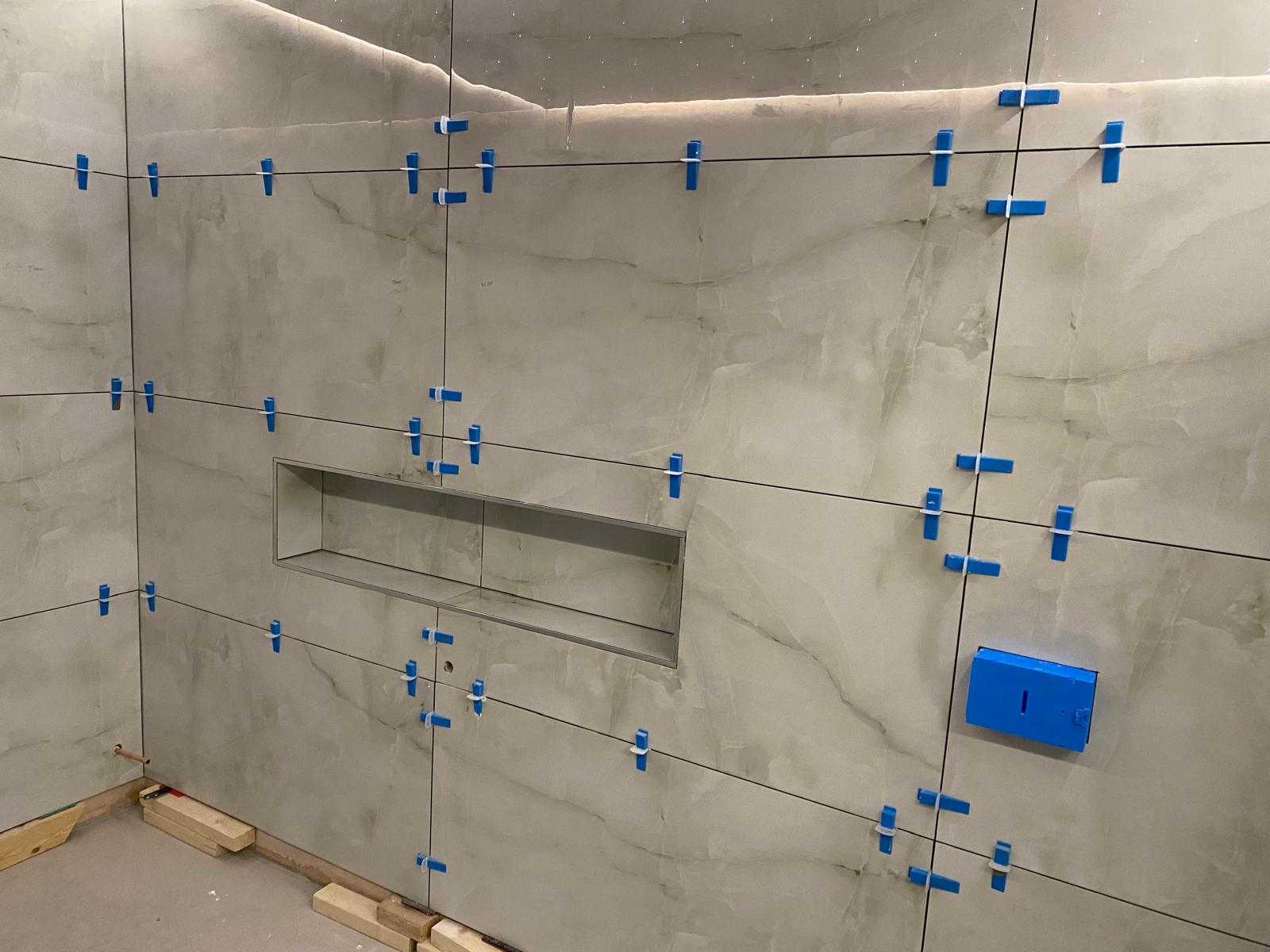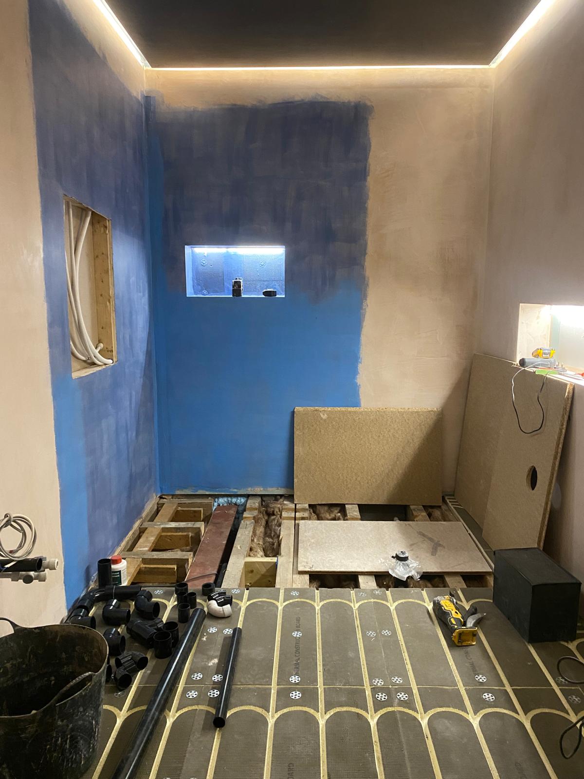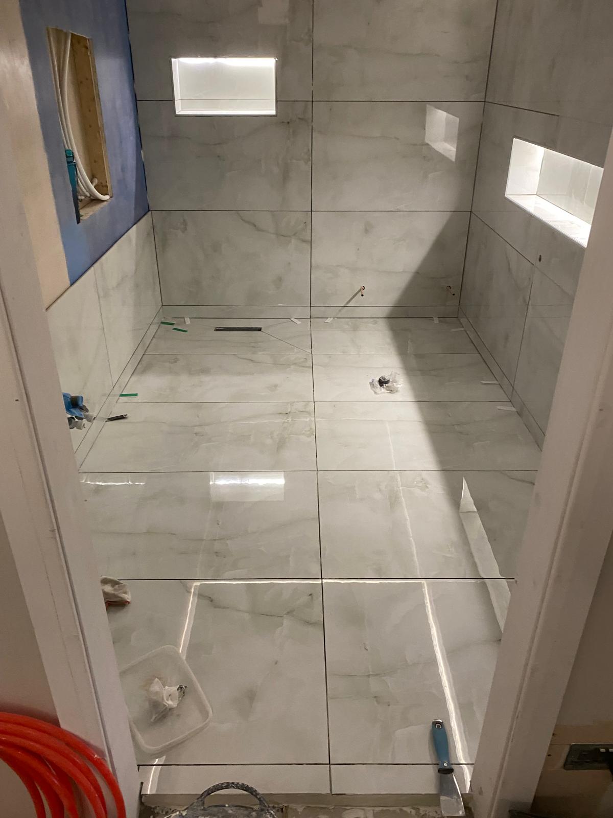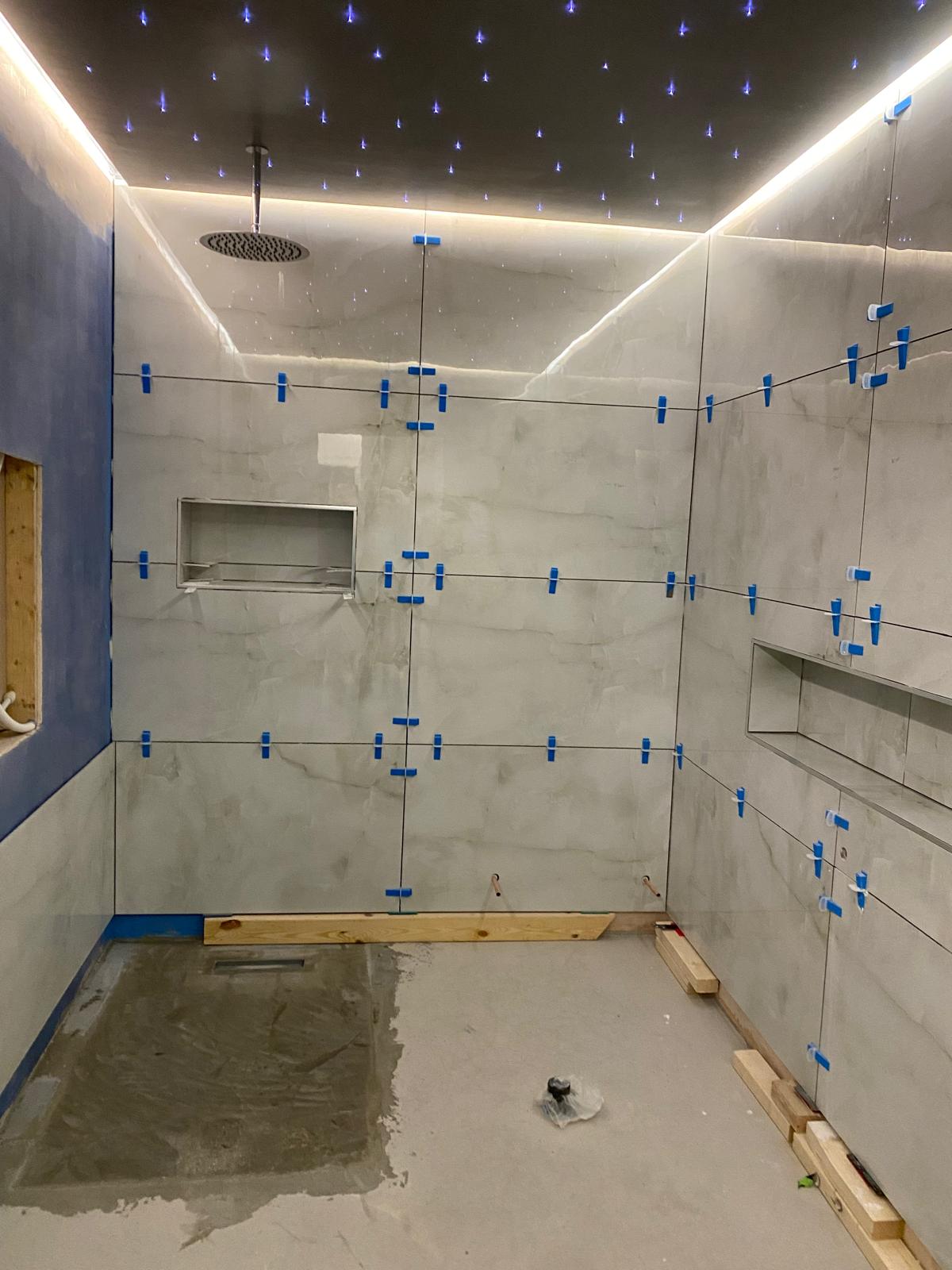 Our client wanted a luxurious and relaxing bathroom that felt like a place to unwind. We added a wet room area finished with large format tiles and included small built-in niches for storage. Fibre optic lights in the ceiling create a beautiful starlit effect at night. The finished space feels calm, elegant and a little bit special.